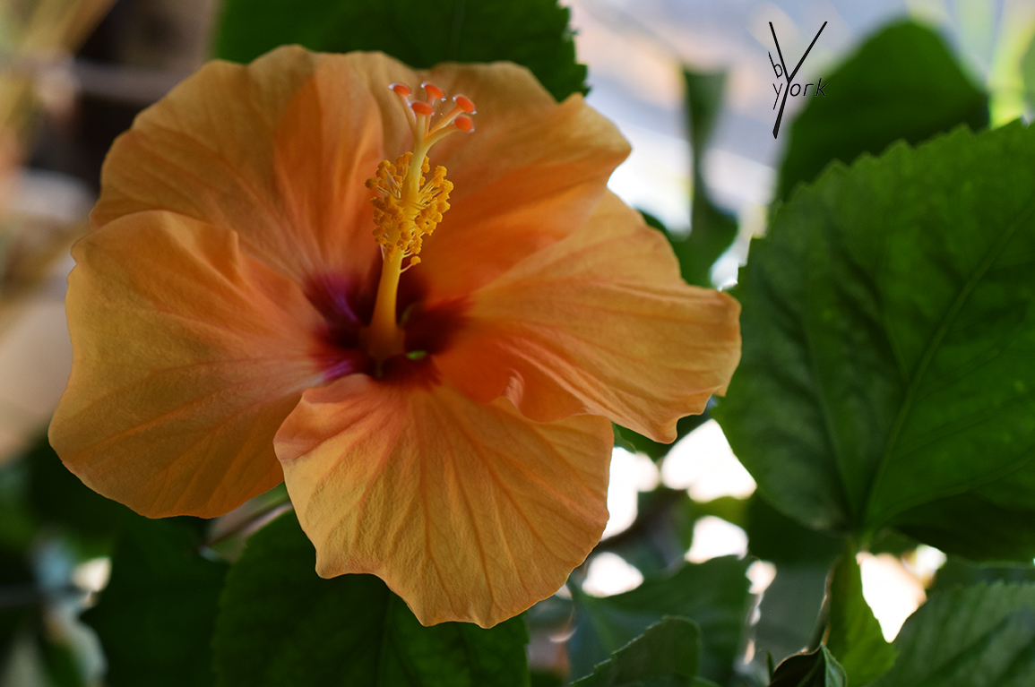 En stor og meget gammel hawaiblomst (Hibiscus, en lille meter høj) er også kommet hjem i vores stue og den er fyldt med orange blomster, der nu åbner sig i nye omgivelser.